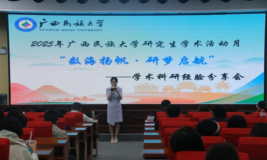 2025年11月26日晚,广西民族大学2025年研究生学术活动月重磅活动——“数海扬帆· 研梦启航”学术科研经验分享会在东校区图书馆十三楼报告厅成功举行。本次活动由共青团广西民族大学委员会党委研究生工作部和研究生院主办,由广西民族大学校研究生会承办,数学科学学院研究生会协办,旨在为研究生搭建一个高水平的学术交流平台。分享会邀请了多位在学术科研、竞赛创新等方面取得优异成绩的优秀研究生代表,他们结合自身经历,为在场同学带来了详实而精彩的分享,现场学术氛围浓厚。